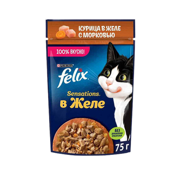 Ваш питомец оценит аппетитный вид и аромат корма Felix® Sensations и полюбит его яркий вкус! И это не все! Вкусный корм FELIX® Sensations содержит Омега 6 жирные кислоты, а также правильное сочетание белка и витаминов для полного удовлетворения ежедневных потребностей Вашей кошки. Следуйте рекомендациям по кормлению, указанным на упаковке. Felix® Sensations (Феликс Сенсейшн). Консервированный полнорационный корм для взрослых кошек с курицей в желе с морковью.